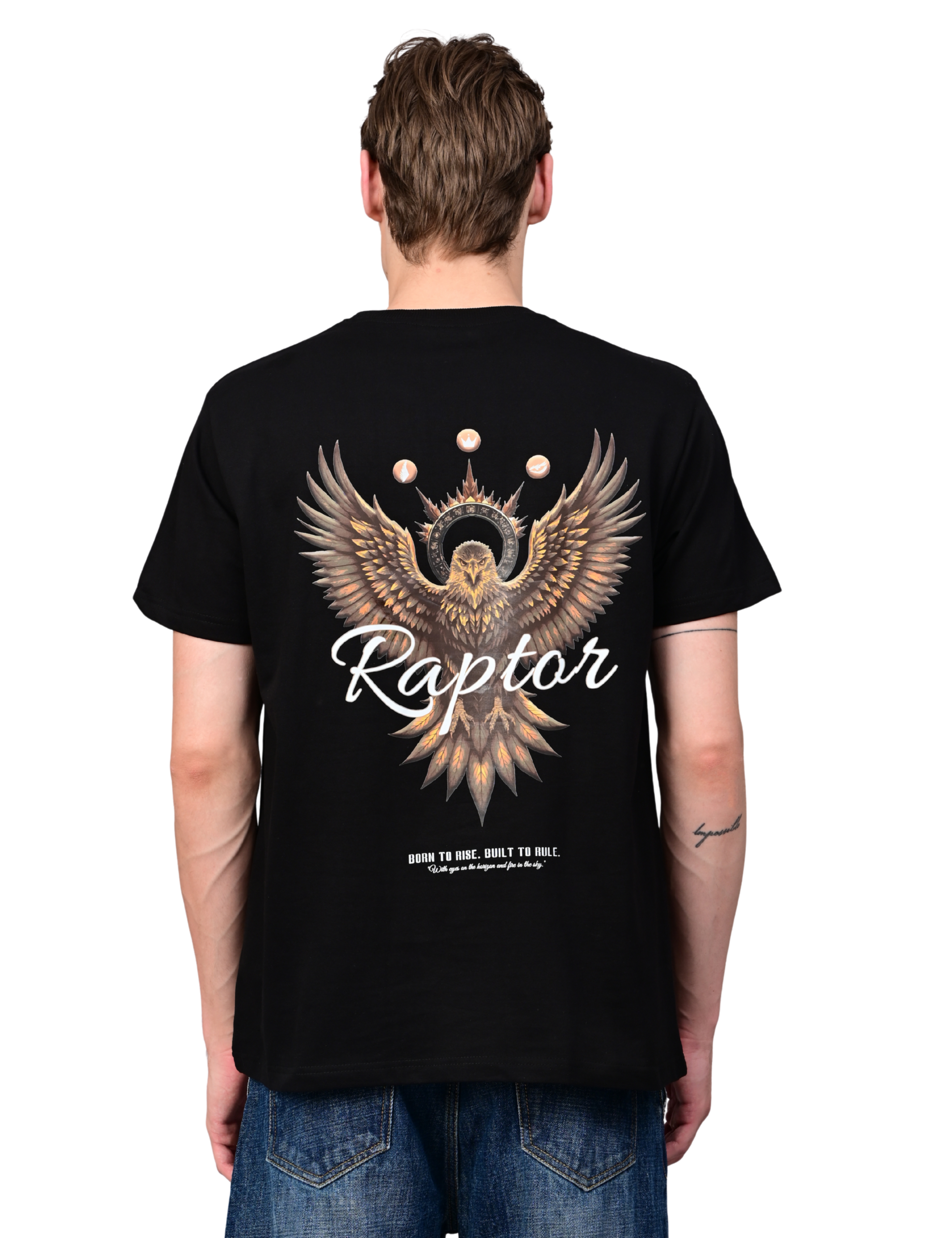 Striking golden raptor artwork on the back symbolising power, focus, and fearless energy, with “Raptor” script layered over the wings.