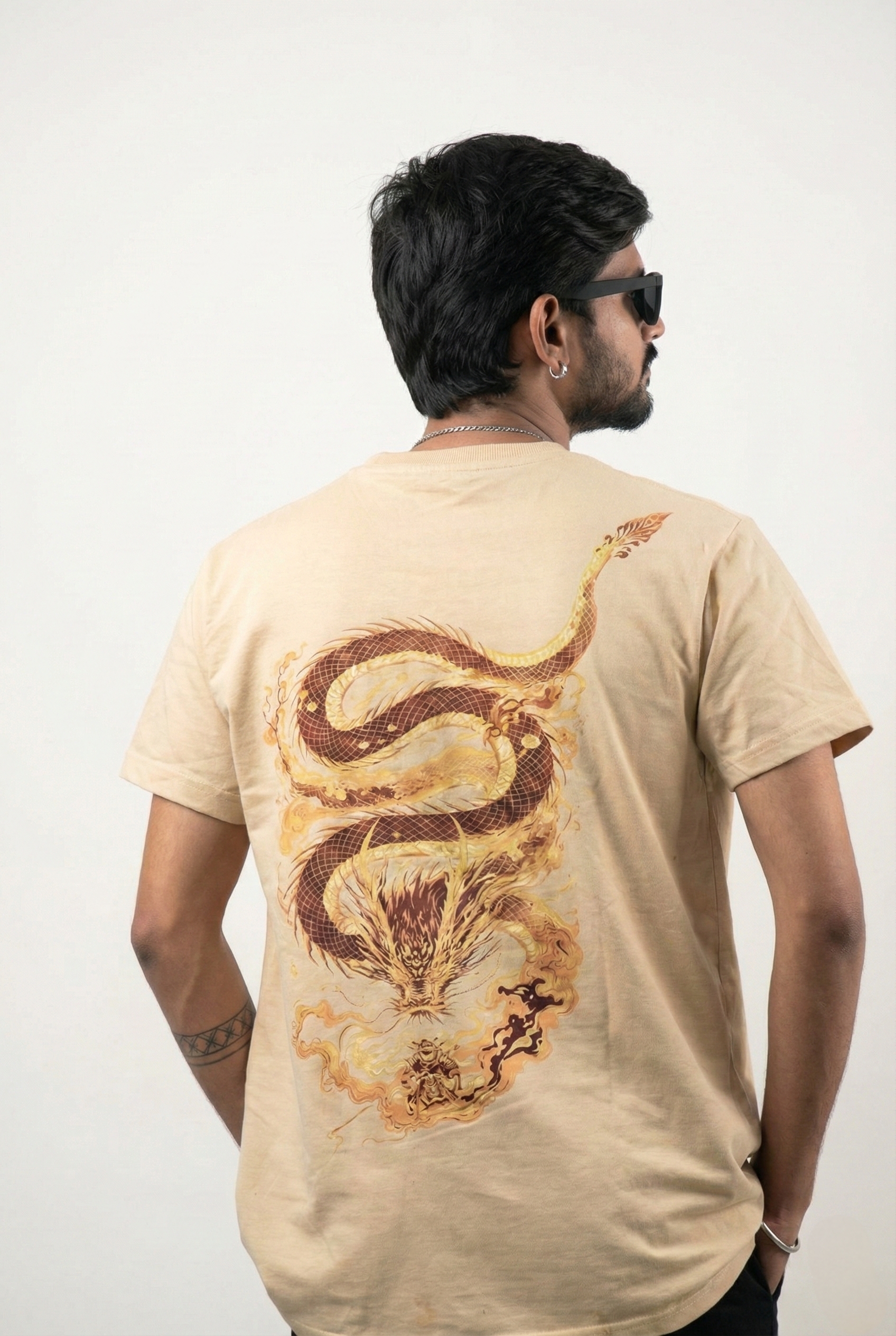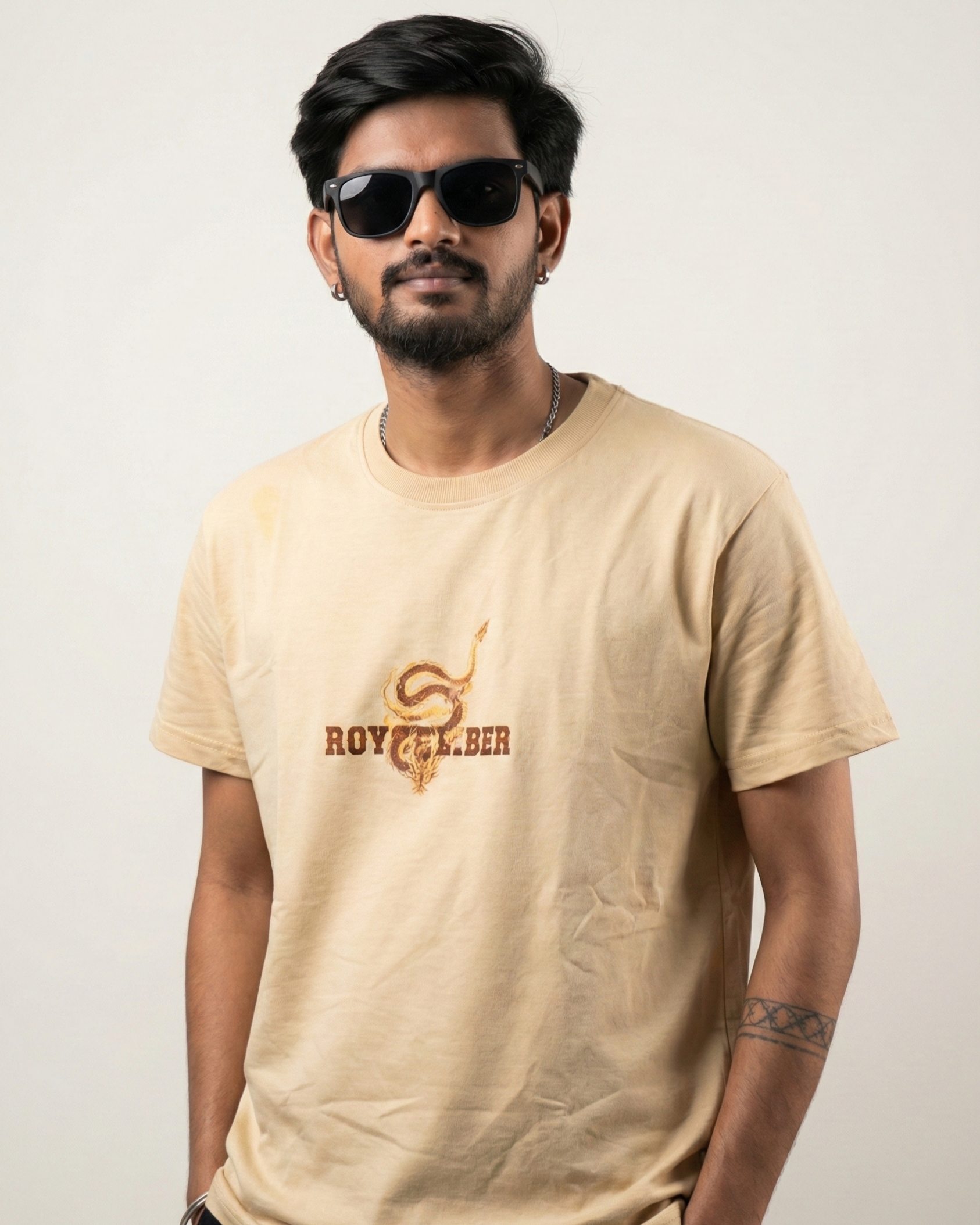 Turn every walk into a statement in the Roycaliber Serpent Flame beige T‑shirt, featuring a clean front logo with snake detail and a full‑back dragon serpent illustration on soft, breathable cotton for everyday streetwear comfort.